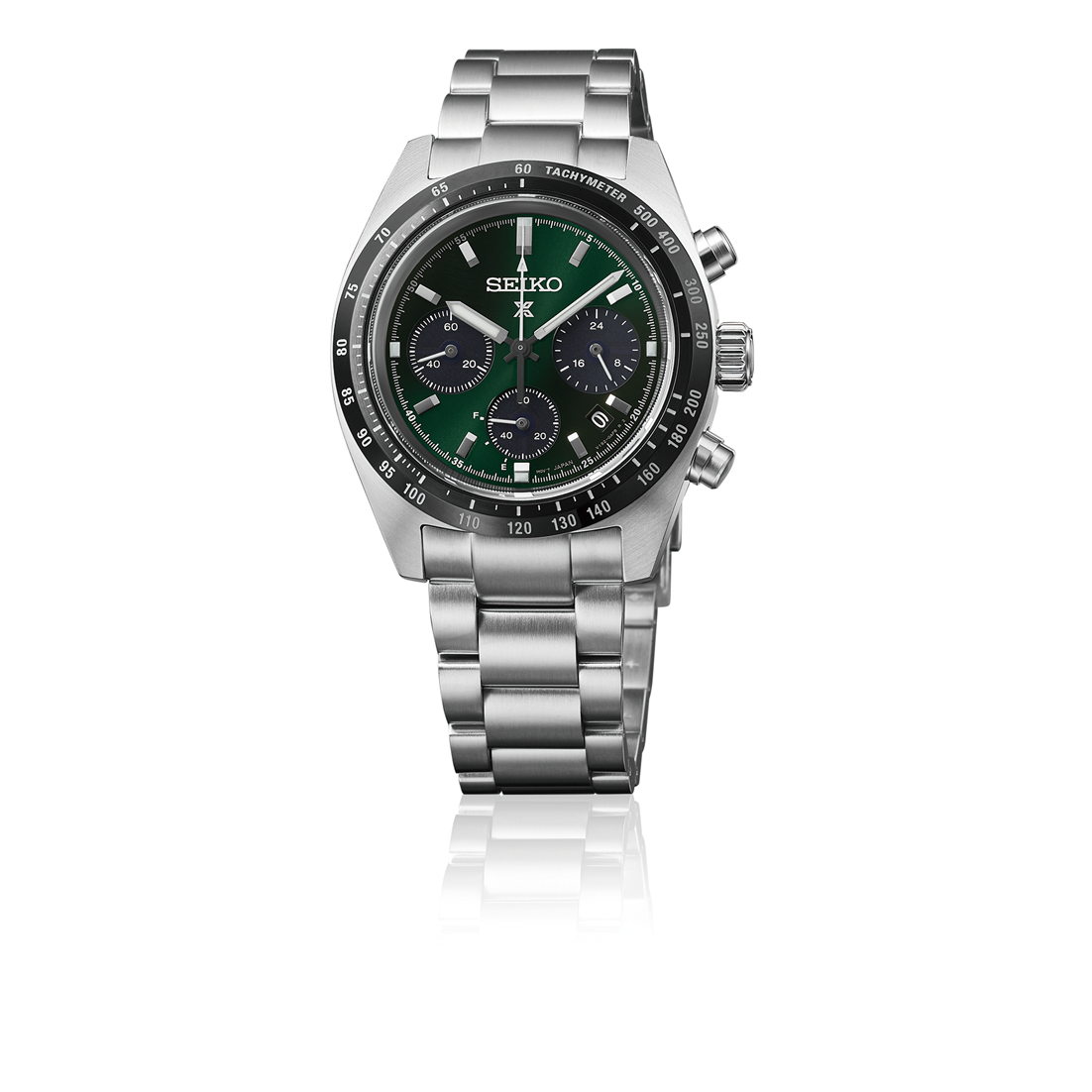 Seiko Prospex Speedtimer SBDL107 – men’s watch manufactured by Seiko. It is equipped with Japanese solar quartz movement and V192 calibre. Stainless steel case of round shape. Case dimensions are 39 mm. in diameter and 13.3 mm. in thickness. The dial of this Seiko watch is green. Display type: analog. This timepiece has sapphire, antireflection coating glass. Stainless steel band, band color: silver. 100 m. water resistance. The watch is from Seiko Prospex collection. The following features are equipped: antimagnetic, chronograph, power reserve indicator, date, glowing hands, glowing markers.